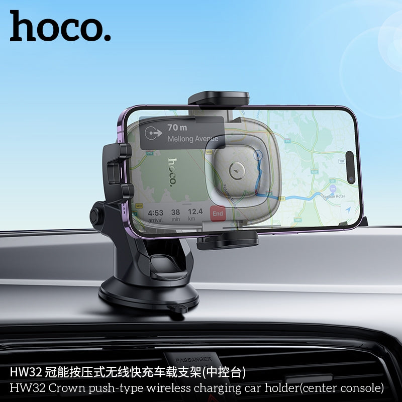 Hoco HW32 Crown Push-Type Dash & Glass Wireless Charging Car Holder Grey